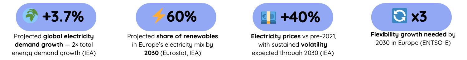 This volatility translates into a structural need for flexibility. ENTSO-E projects that Europe will require three times more flexibility capacity by 2030 to maintain system balance. On top of this, new sources of demand are emerging: EVs could represent nearly 10% of global demand by 2030 (IEA, 2024), while data centers are on track to double their electricity use by the end of the decade (IEA, 2024).