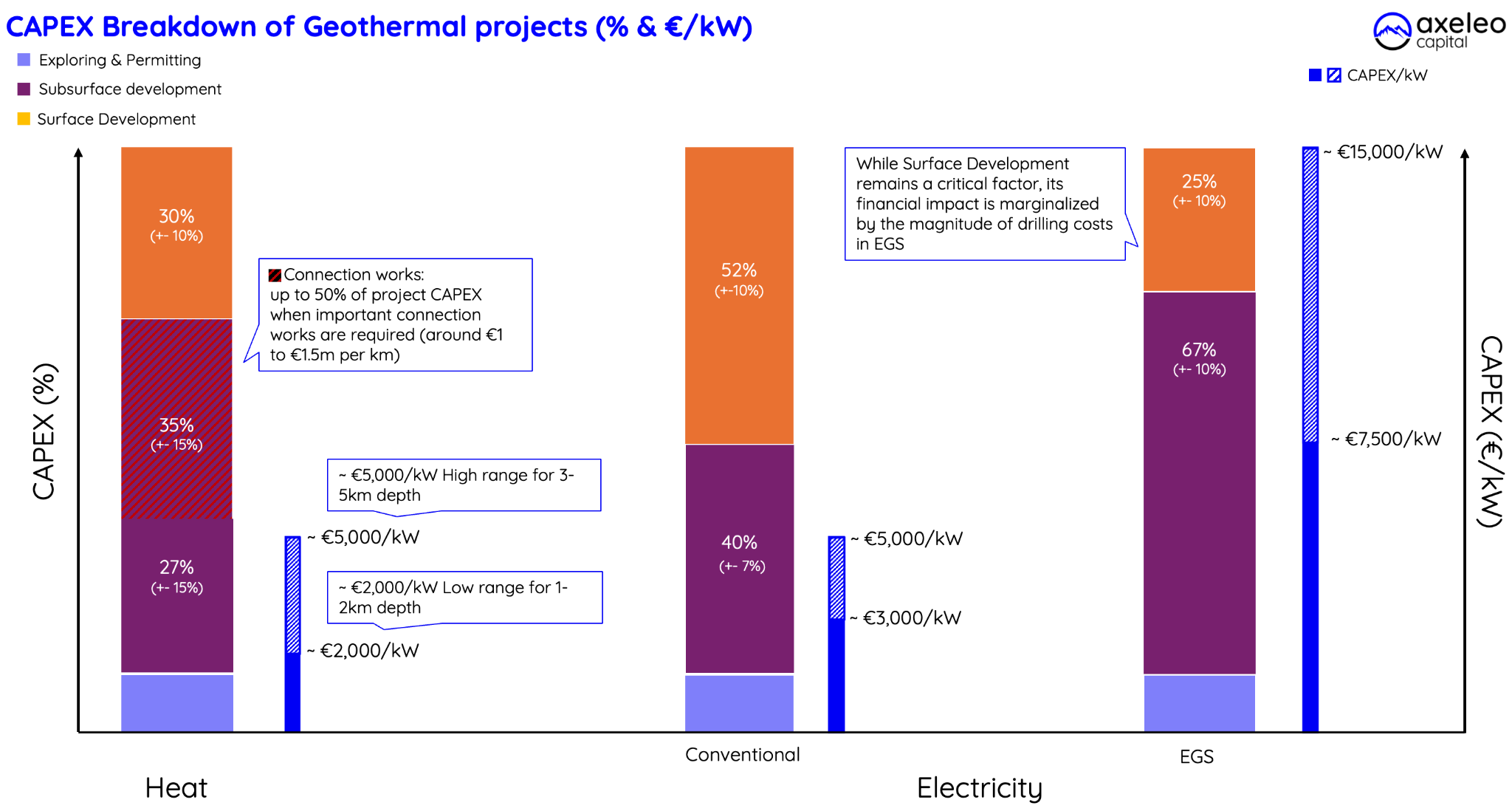 Around 63% of CAPEX are related to Subsurface development among which 27% are associated to drilling and 35% (+/- 15%) are associated to connection works. Surface development represents ~30% which can also fluctuate depending on equipment required (heatpumps or not).