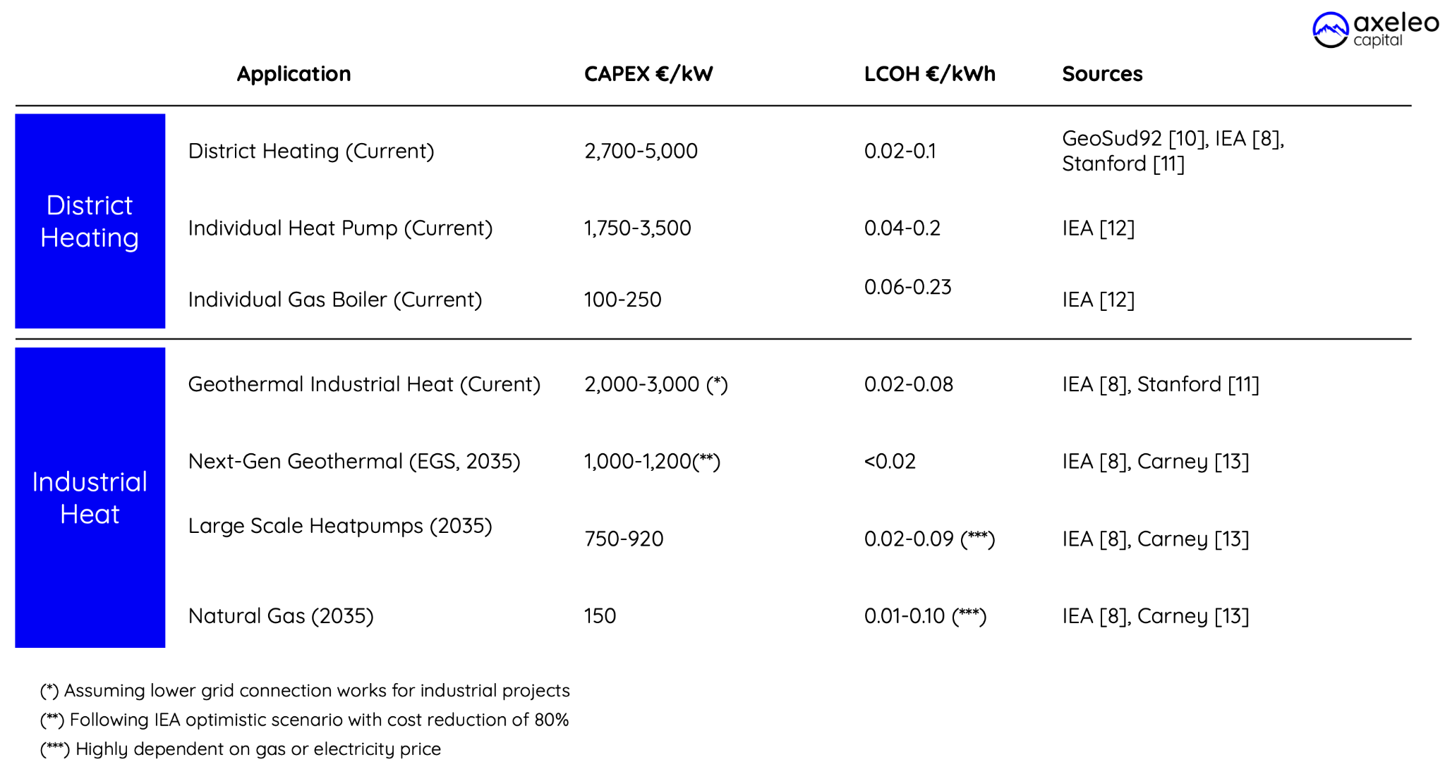 However finding the resource next to the plant is not so common, when the distance increase you hit the same 2,000-3,000 range. The Rittershoffen Roquette project (2016) for instance reached 2,300€/kW delivering steam at 165° with a 10km pipe work to connect the ressource to the facility. [9]