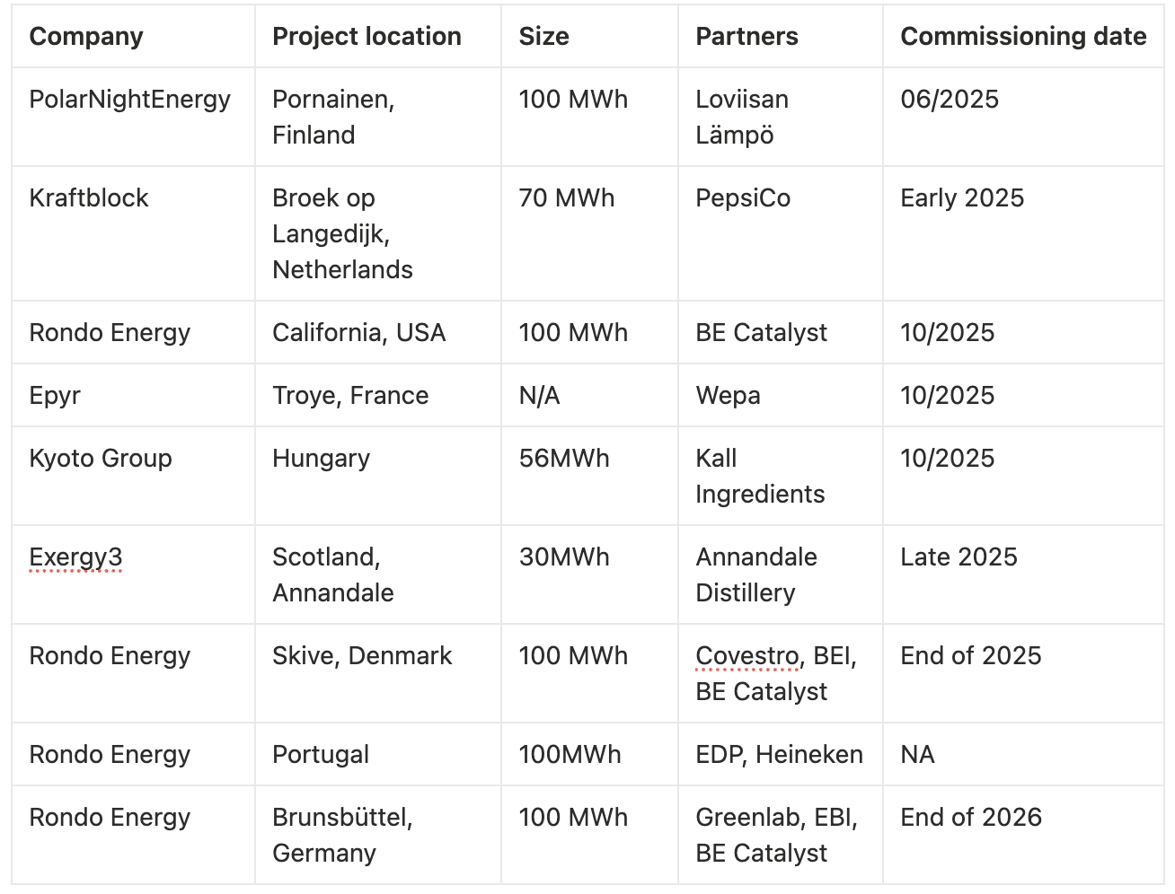 Some players are shaping the fundraising landscape. In the US, SHS developers like Antora Energy and Rondo Energy raised more than 250M€ combined. In Europe, EnergyNest made headlines with a significant investment from InfraCapital but a new generation of SHS startups are emerging including Epyr, Elstor or Exergy3. Innovators like Cartesian or Cowa are developing LHS systems promising higher energy density for specific applications.